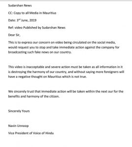 Le Vice président de la Voice of Hindu (VOH), Navin Unoop n’a pas tardé de réagir suite à la diffusion d’une vidéo de la chaine indienne, Surdarshan News. Selon Navin Unoop, cette vidéo porte atteinte à l’harmonie sociale de Maurice et projette également une mauvaise image de notre île multiraciale. « J’ai adressé une lettre à cette chaine indienne et à diverses autorités concernées. Je condamne sévèrement le contenu de cette vidéo », affirme Navin Unoop.