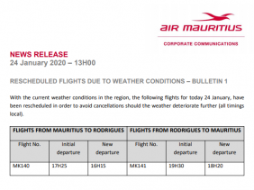 Dû au mauvais temps qui persiste à Maurice, Air Mauritius a reprogrammé plus d’une dizaine de ces vols ce 24 janvier. Il s’agit des vols au départ de...